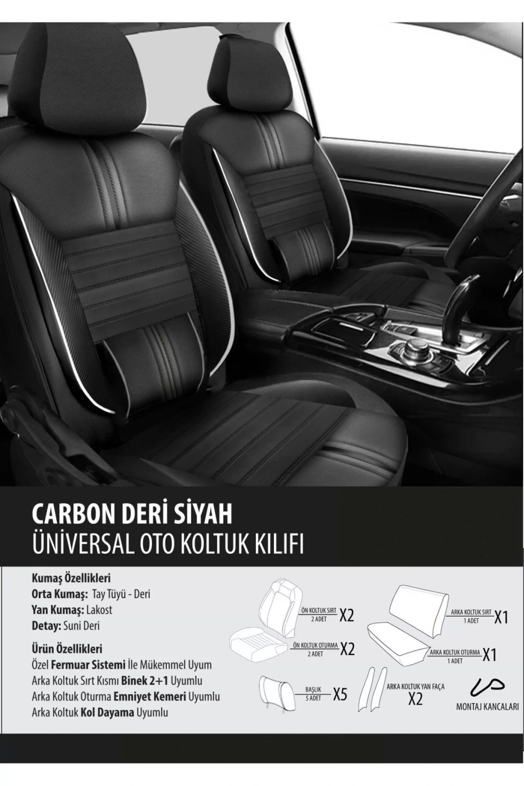 ÜRÜN ÖZELLİKLERİ ÖN ARKA BAŞLIKLAR DAHİL SET OLARAK GÖNDERİLMEKTEDİR.; MONTAJ KANCALARI İÇERİSİNDEN ÇIKMAKTADIR.; 4 MM ESNEK DERİ VE DÖŞEME KUMAŞINDAN ÜRETİLMİŞTİR.; ÖN KOLTUKLARIN ARKASINDA CEP BÖLÜMÜ VARDIR.; ÖN KOLTUKLARIN YASLANMA YERLERİ SÜNGER İLE DESTEKLENMİŞTİR.; ÖN KOLTUKLARIN YANLARI SÜNGER İLE DESTEKLENEREK KANAT YAPILMIŞTIR.; SPORTİF FİTİLLERİ İLE ŞIK DURMAKTADIR.; ESNEK KUMAŞTAN ÜRETİLMESİ NEDENİYLE POTLUK YAPMAZ.; GERDİREREK MONTAJ YAPILIRSA KOLTUKLARINIZI İYİCE SARAR.; KUTU İÇERİĞİ 2 ADET ÖN KOLTUK YASLANMA YERİ 2 ADET ÖN KOLTUK OTURMA YERİ 1 ADET ARKA KOLTUK OTURMA YERİ 1 ADET ARKA KOLTUK YASLANMA YERİ 5 ADET BAŞLIK MONTAJ KANCALARI